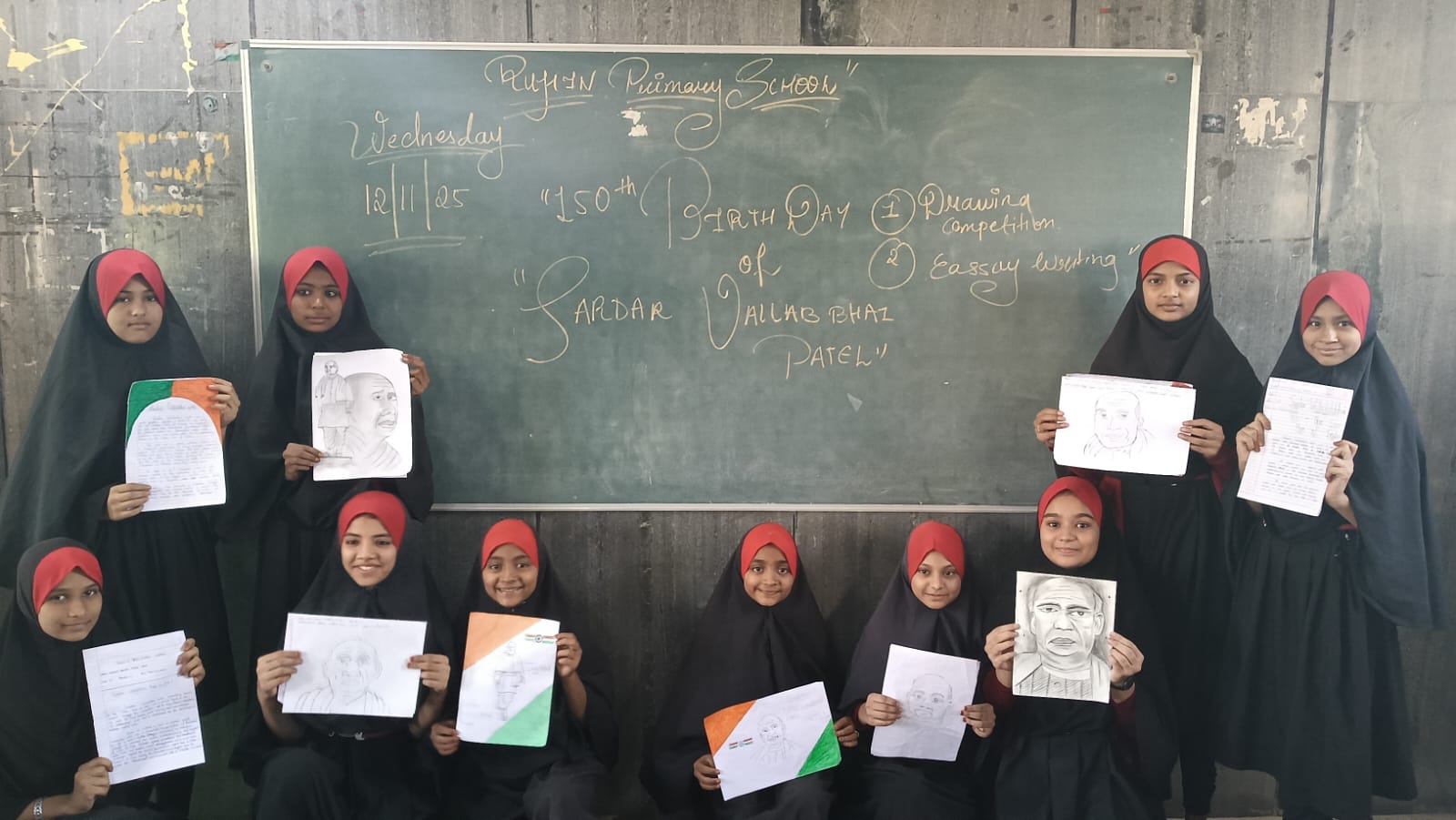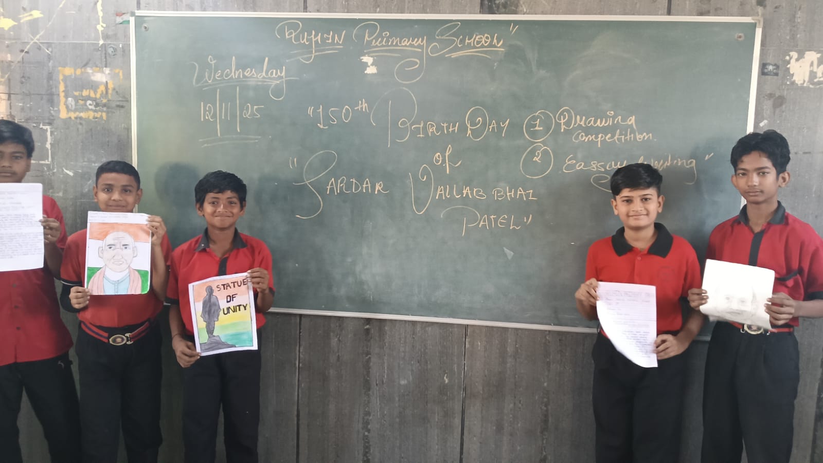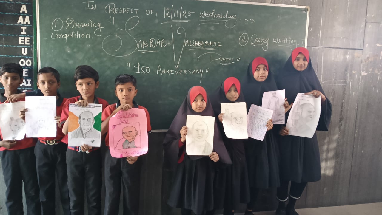 AS,ALL THE SCHOOL HAS DECIDED TO TAKE PART IN THE CELEBRATION OF SARDAR VALLABHBHAI PATEL 150TH JAYANTI AND IN THAT THERE WAS ESSAY COMPETITION AND DRAWING COMPETITION IT WAS A PLEASURE TO SEE THEM SO MUCH ENTHUSIASTIC ABOUT NEW THINGS .